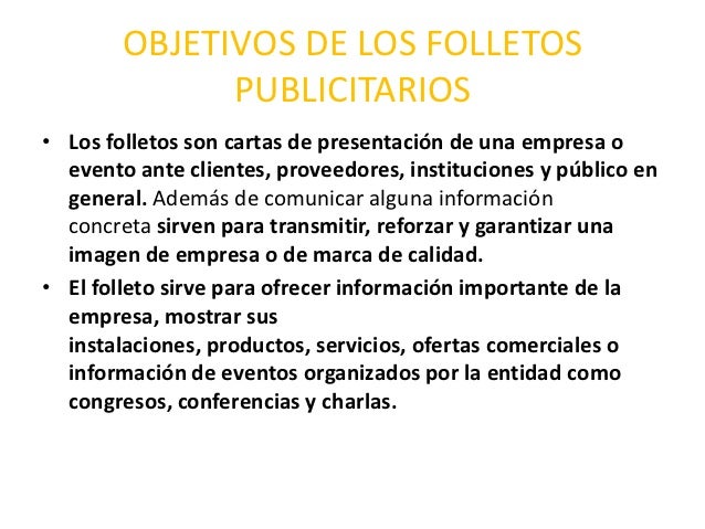 - 2. OBJETIVOS DE LOS FOLLETOS PUBLICITARIOS• Los folletos son cartas de presentación de una empresa o evento ante clientes, proveedores, instituciones y público en general. Además de comunicar alguna información concreta sirven para transmitir, reforzar y garantizar una imagen de empresa o de marca de calidad.• El folleto sirve para ofrecer información importante de la empresa, mostrar sus instalaciones, productos, servicios, ofertas comerciales o información de eventos organizados por la entidad como congresos, conferencias y charlas.