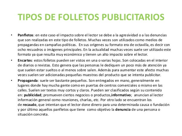 - 3. TIPOS DE FOLLETOS PUBLICITARIOS• Panfletos: en este caso el impacto sobre el lector se debe a la agresividad o a las denuncias que son realizadas en este tipo de folletos. Muchas veces son utilizados como medios de propagandas en campañas políticas. En sus orígenes su formato era de octavilla, es decir con ocho recuadros o imágenes principales. En la actualidad muchas veces suele ser utilizado este formato ya que resulta muy económico y tienen un alto impacto sobre el lector.• Encartes: estos folletos pueden ser vistos en una o varias hojas. Son colocadas en el interior de diarios o revistas. Esto genera que las personas le dediquen un poco más de atención ya que suelen estar sueltos o al menos sobre salen. Además para aumentar este afecto muchas veces suelen ser adicionadas pequeñas muestras del producto que se intenta publicitar.• Propaganda: suele ser bastante pequeños. Son entregados en mano, generalmente en lugares donde hay mucha gente como en puertas de centros comerciales o mismo en las calles. Suelen ser textos muy cortos y claros. Pueden ser clasificados según su contenido en: publicidad; promueven ciertos negocios o productos,informativo; anuncian al lector información general como reuniones, charlas, etc. Por otro lado se encuentran los de recaudo, que intentan que el lector done dinero para una determinada causa o fundación y por último aquellos panfletos que tiene como objetivo la denuncia de una persona o situación concreta.