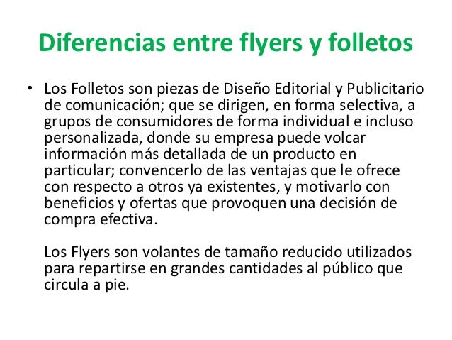 - 4. Diferencias entre flyers y folletos• Los Folletos son piezas de Diseño Editorial y Publicitario de comunicación; que se dirigen, en forma selectiva, a grupos de consumidores de forma individual e incluso personalizada, donde su empresa puede volcar información más detallada de un producto en particular; convencerlo de las ventajas que le ofrece con respecto a otros ya existentes, y motivarlo con beneficios y ofertas que provoquen una decisión de compra efectiva. Los Flyers son volantes de tamaño reducido utilizados para repartirse en grandes cantidades al público que circula a pie.